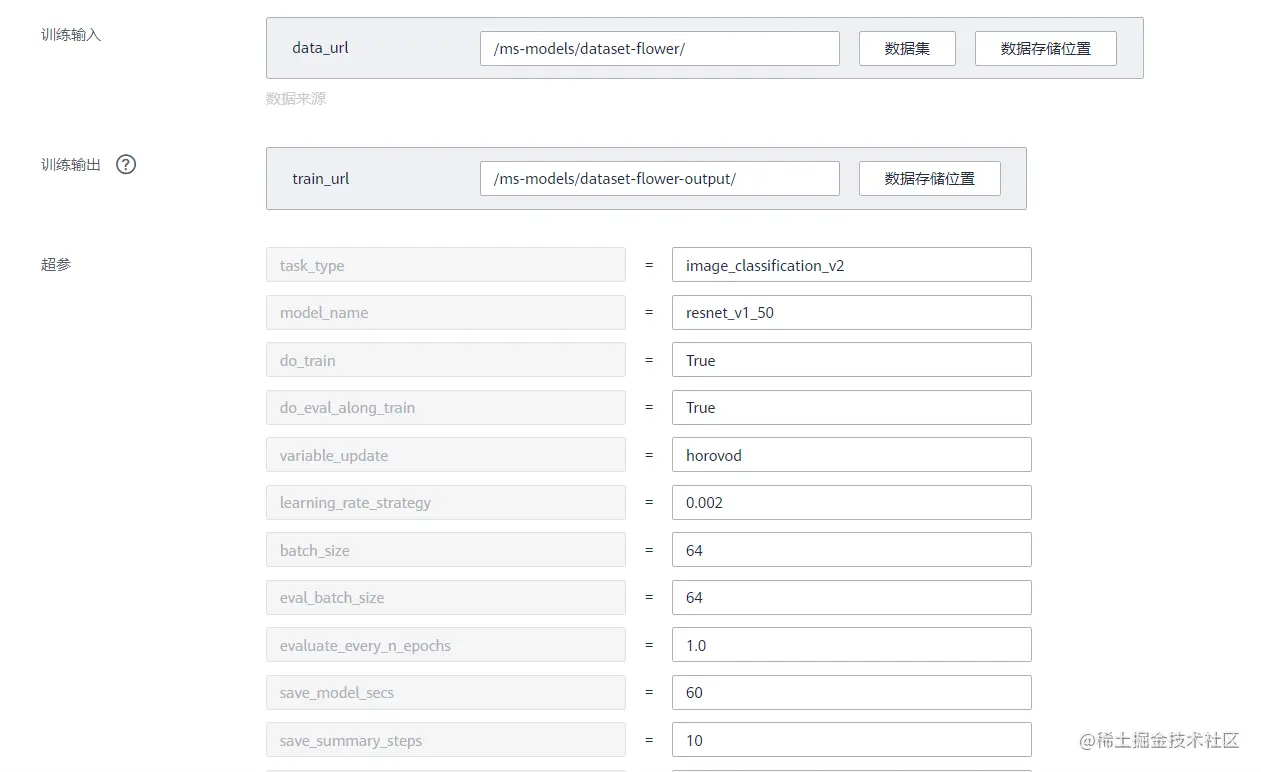 本次使用的算法为ResNetv150算法(图像分类/TensorFlow/Ascend910训练),模型转换任务与ResNet50算法不一样的参数如下所示。