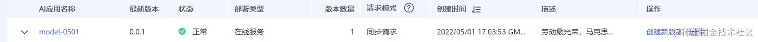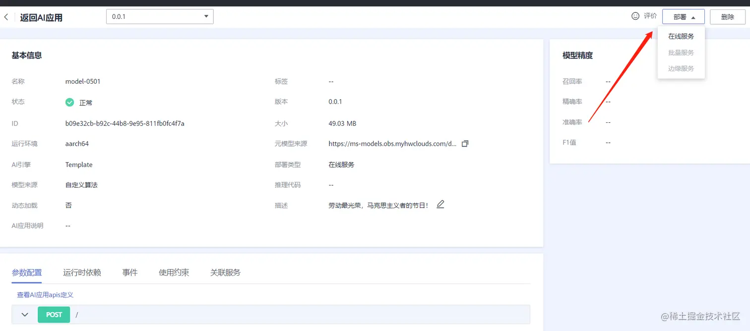 - 在“AI应用管理 >AI应用 >我的AI应用”列表中,单击AI应用名称进入详情页,单击右上角的“部署 > 在线服务”