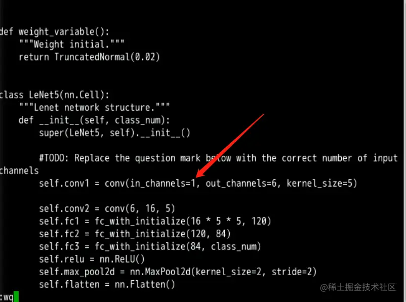 修改lenet.py如下,将通道数改为1,然后保存退出