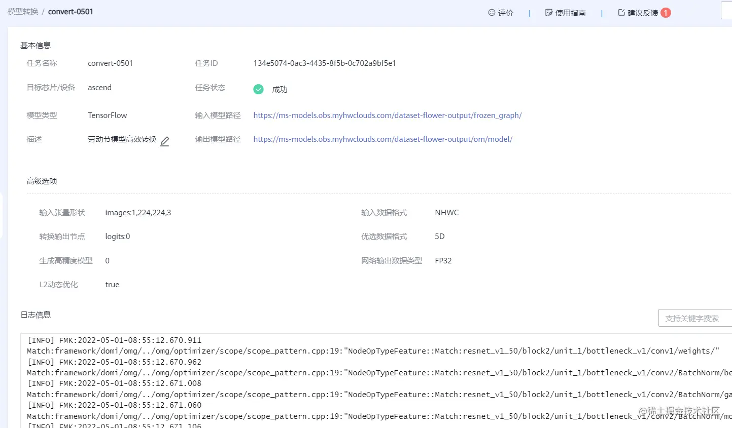 “转换输出目录” :请选择训练作业输出路径下的“<输出路径>/om/model”目录。