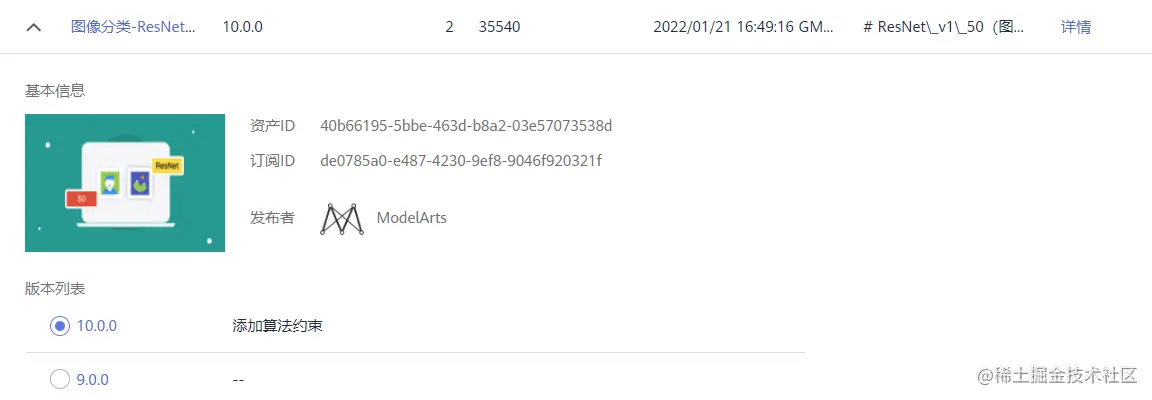 目前 “ResNet50” 算法发布在AI Gallery中。您可以前往AI Gallery,订阅此模型,然后同步至ModelArts中。