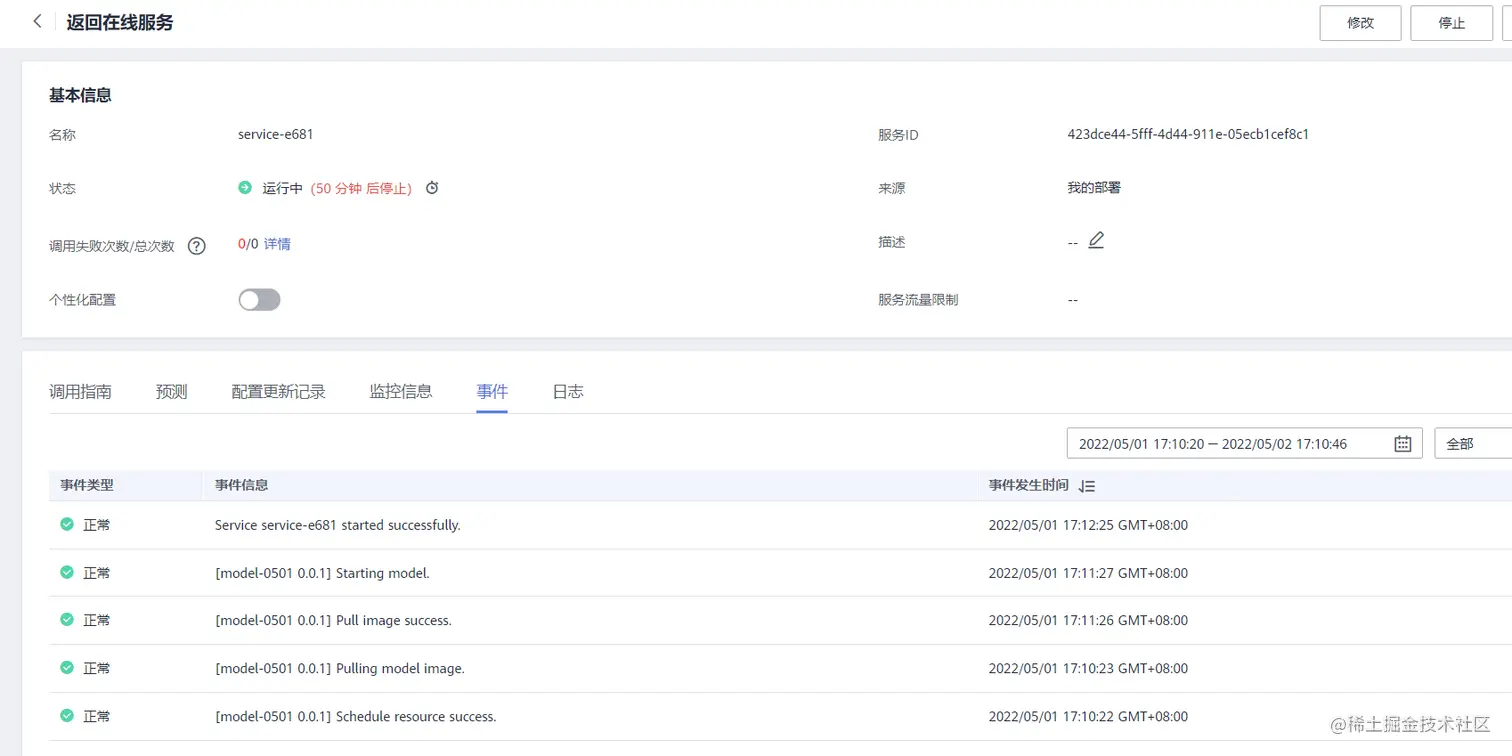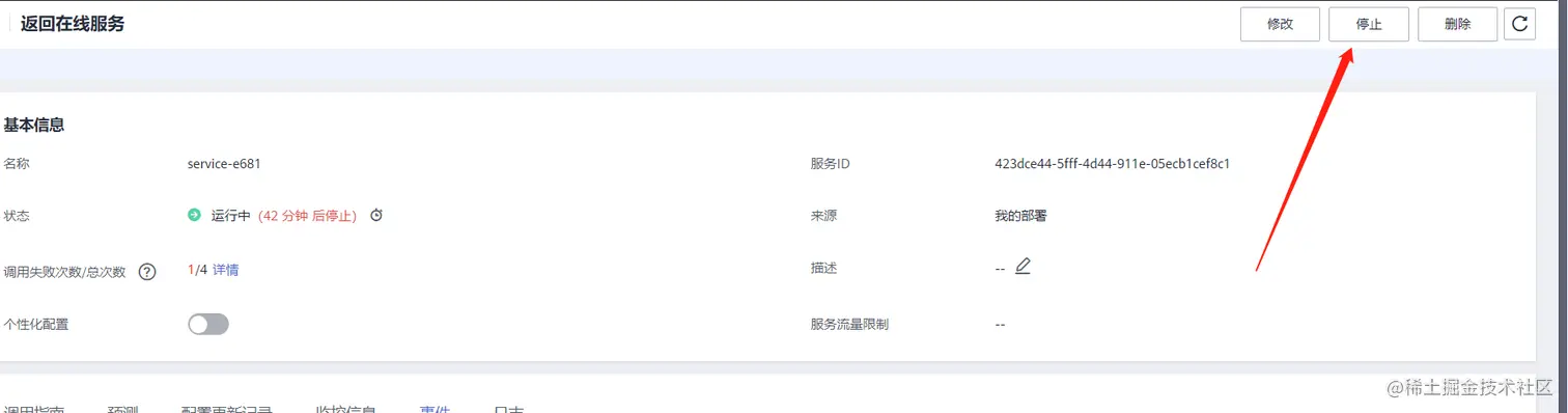 • 在“在线服务”页面,“停止”或“删除”刚创建的在线服务。