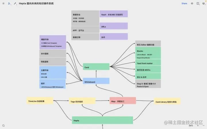 Hepta 提供了内容组织的无限可能。Hepta 相当于某种程度上 Roam、Notion 的可视化版本。Hepta 实现了任务管理的可视化、文件组织的可视化、思维过程的可视化、思维结果的可视化。