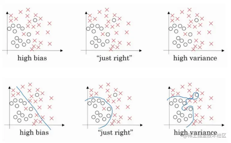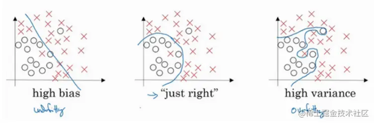 左图是高偏差,右图是高方差,中间是恰好合适。