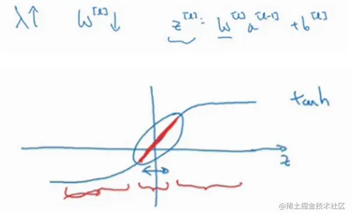 总结来说,如果正则化参数变得很大,参数W很小,z也会相对变小,此时忽略b的影响,z会相对变小。激活函数tanh曲线函数会相对呈线性,整个神经网络会计算离线性函数近的值,不会发生过拟合。