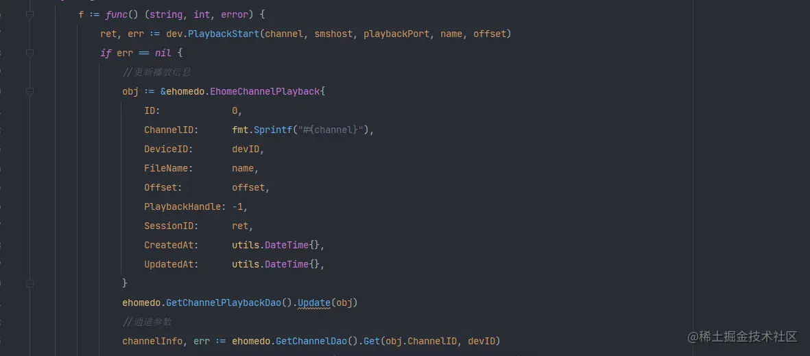 f := func() (string, int, error) { ret, err := dev.PlaybackStart(channel, smshost, playbackPort, name, offset) if err == nil { //更新播放信息 obj := &ehomedo.EhomeChannelPlayback{ ID: 0, ChannelID: fmt.Sprintf("%d", channel), DeviceID: devID, FileName: name, Offset: offset, PlaybackHandle: -1, SessionID: ret, CreatedAt: utils.DateTime{}, UpdatedAt: utils.DateTime{}, } ehomedo.GetChannelPlaybackDao().Update(obj) //通道参数 channelInfo, err := ehomedo.GetChannelDao().Get(obj.ChannelID, devID)