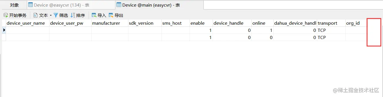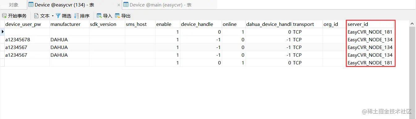 后来通过分析版本功能,联想到新旧数据库所有的表结构不一样,于是重新部署了完整的集群版本,添加一个设备后,将新旧数据库拿出来做对比,发现Device这张表的表结构不一样,新表的表结构中多了server_id的字段。