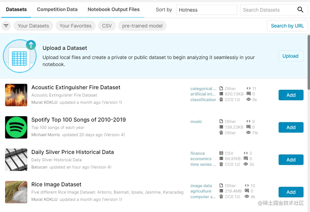 Kaggle可能因其举办的数据科学竞赛而闻名,其中一些竞赛提供5位数的奖金,并有数百个团队参加。除了这些比赛,Kaggle还允许用户发布和搜索数据集,他们可以将其用于机器学习项目。要使用这些数据集,你可以在你的浏览器中使用Kaggle笔记本或Kaggle的公共API来下载他们的数据集,然后你可以在你的机器学习项目中使用。