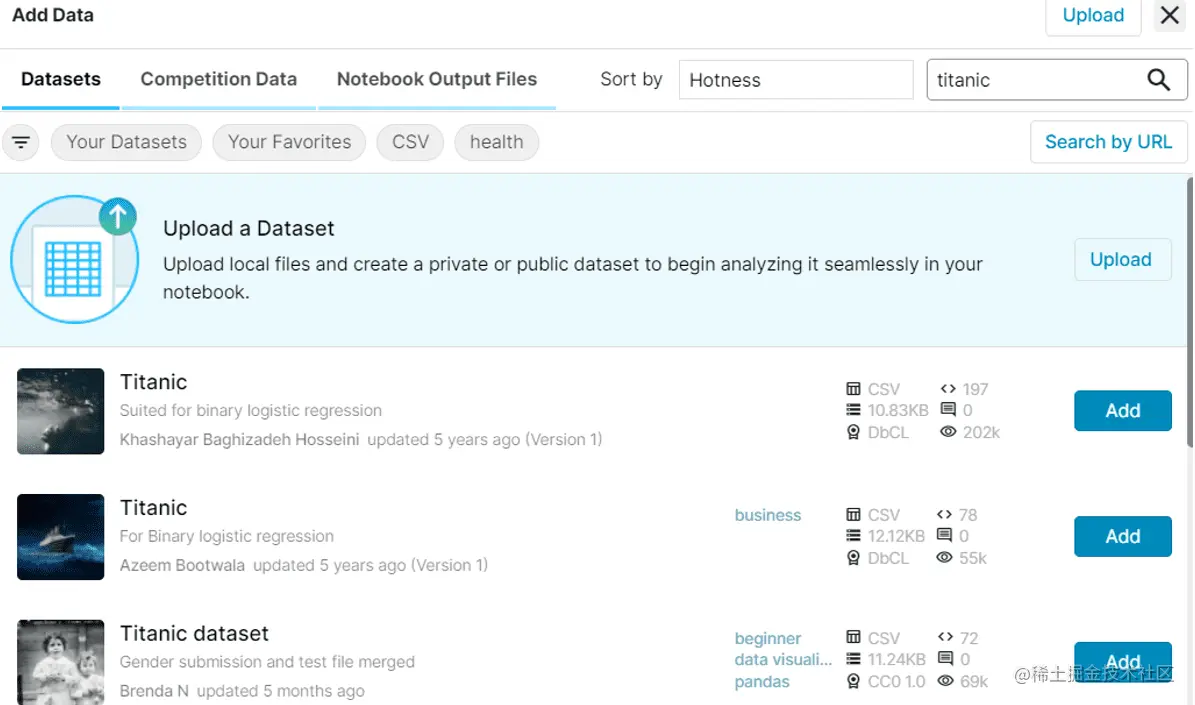应该会出现一个窗口,显示一些公开可用的数据集,并让你选择上传自己的数据集以用于你的Kaggle笔记本。