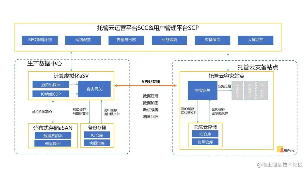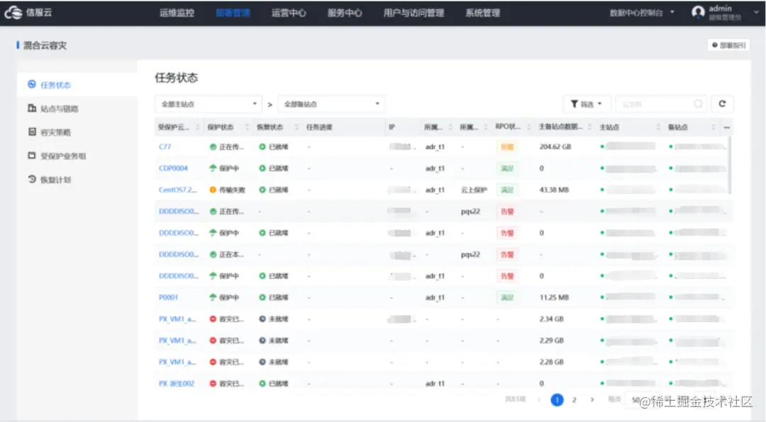 在超融合上,用户无需额外配置,即可实现线上线下容灾,无需专业灾备能力,即可通过简单灾备策略配置实现一键灾备,托管云平台实现线下、线上资源统一管理可视,在管理平台可对线上资源,线下站点状态,容灾链路,任务状态进行实时监控、告警,帮助用户查看目前灾备任务状态,灾备策略支持单个云主机或业务组,根据业务场景灵活配置。