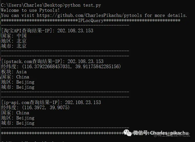 来获取对方当前所在地的IP地址,有了IP地址,我们就可以利用公众号之前开源的pikachupytools这个python包查询对方现在的位置了,例如: