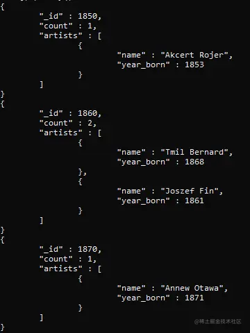 在上述数据中,我们将应用一个命令来创建一个以年份为属性的桶(组)来分组数据。我们还创建了边界,其中提到了出生和死亡的年份。在这个命令中应用的条件包括计数变量来计算出现的次数。我们还在这里使用了连接方法,将第一个和第二个名字都合并为字符串。此外,还将显示出生年份。id取决于年份。