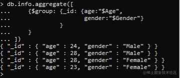 >>db.info.aggregation ([ {group:{\_id:{age:"Age",gender:"$Gender" } }] )