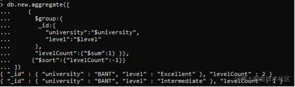 >>db.new.aggregate([ {group:{ \_id: { "university":"university", "level":"level"}, "levelCount":{"sum": 1}}},{"$sort":{"levelCount":-1}}])