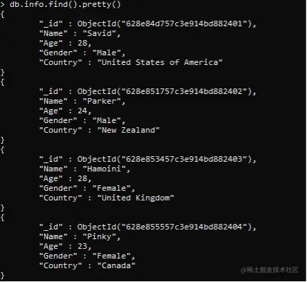 同样地,所有的数据都将被插入。你可以通过使用find()命令看到所有插入的数据