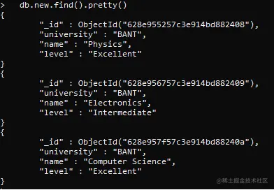 首先,让我们显示我们的集合 "new "中的文档。我们已经创建了一个集合,并在前面按照上面描述的相同步骤向其中添加了数据。我们将只通过find()函数显示集合中的所有项目。