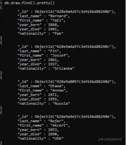 为了详细说明这个概念,我们将看一下我们已经创建的一个集合,现在我们将把这些命令应用到这个集合中。我们创建了一个 "draw "集合,它存储了关于一个人的基本信息。我们已经显示了之前输入到集合中的所有4行。