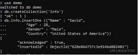 一旦完成了数据库的创建,数据将被插入到数据库中。而对于数据的输入,我们使用的是创建 "集合",这些是容器,在其中存储无限的数据,发挥着重要作用。在同一时间,我们可以在一个数据库中创建许多集合。这里我们将创建一个名字为 "info "的数据库。