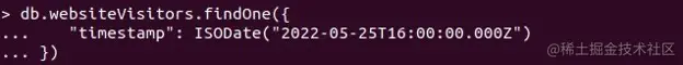 时间序列文档可以像MongoDB的其他集合的文档一样被查询。例如,通过MongoDB Shell,我们使用findOne来寻找webVisitors集合()中的文档,如下所示。