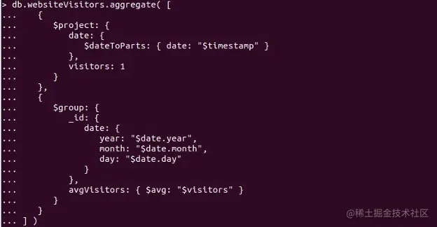 在这里,我们使用了一个聚合管道,如增加更多的查询功能。下面的例子中,聚合管道通过测量数据组合所有的文档,然后提供一个网站当天所有访客测量的平均值。