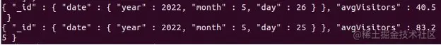 当我们在集合websiteVisitors上执行聚合管道时,输出产生了来自集合 "websiteVisitors "的访问者文档的平均值,如下所示。