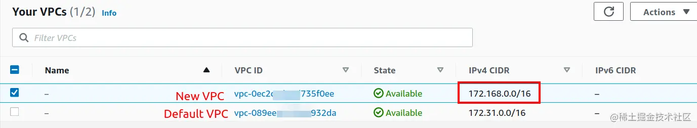 现在,让我们检查一下所需的VPC是否已经创建。前往VPC控制台,并检查可用的VPC。