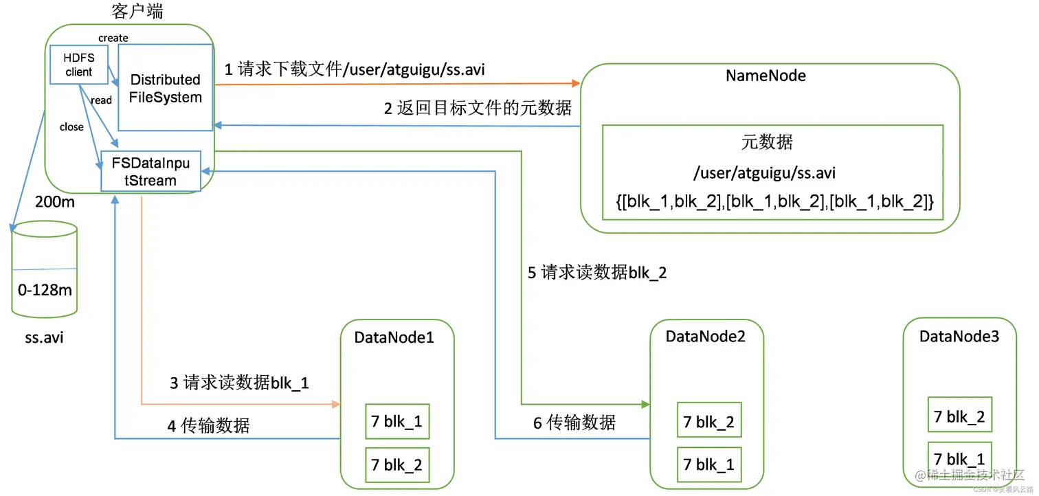 - 客户端就会根据元数据去数据所在的DataNode节点发送读数据请求