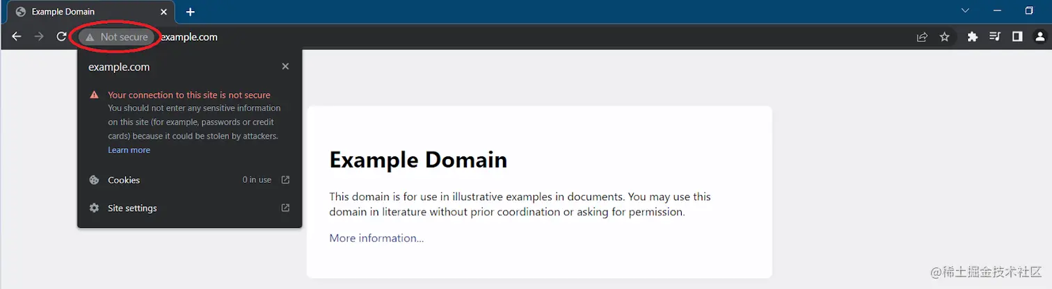 当一个网站不安全时,你应该看到一个带有文字 "不安全 "的隔离区图标,如下图所示。点击该图标将向你展示更多细节。
