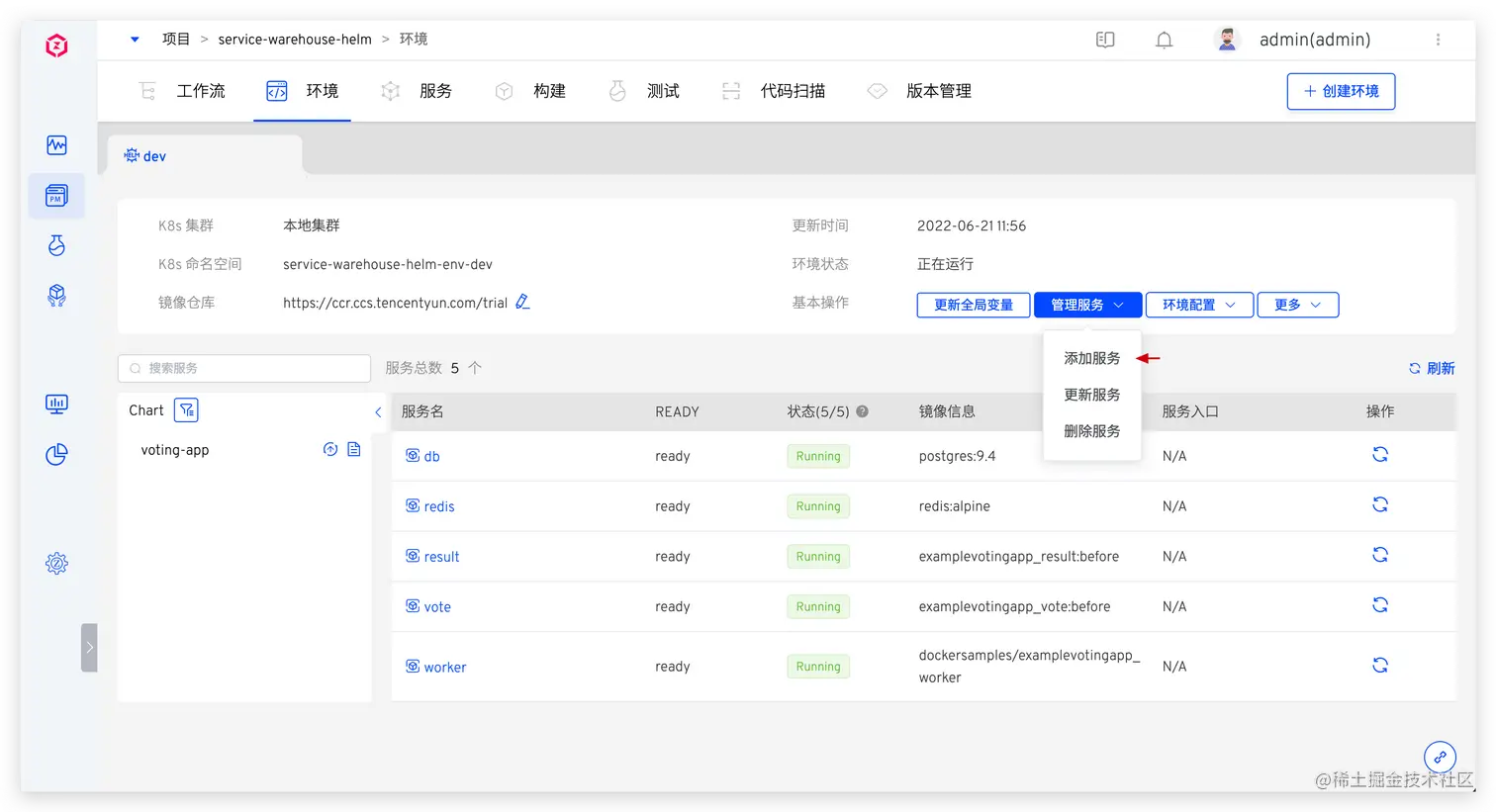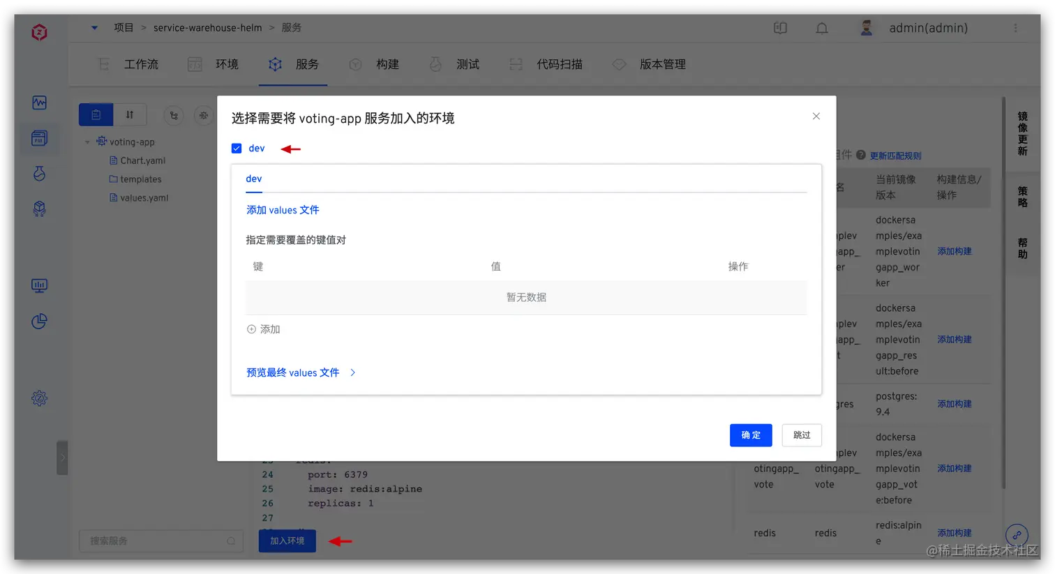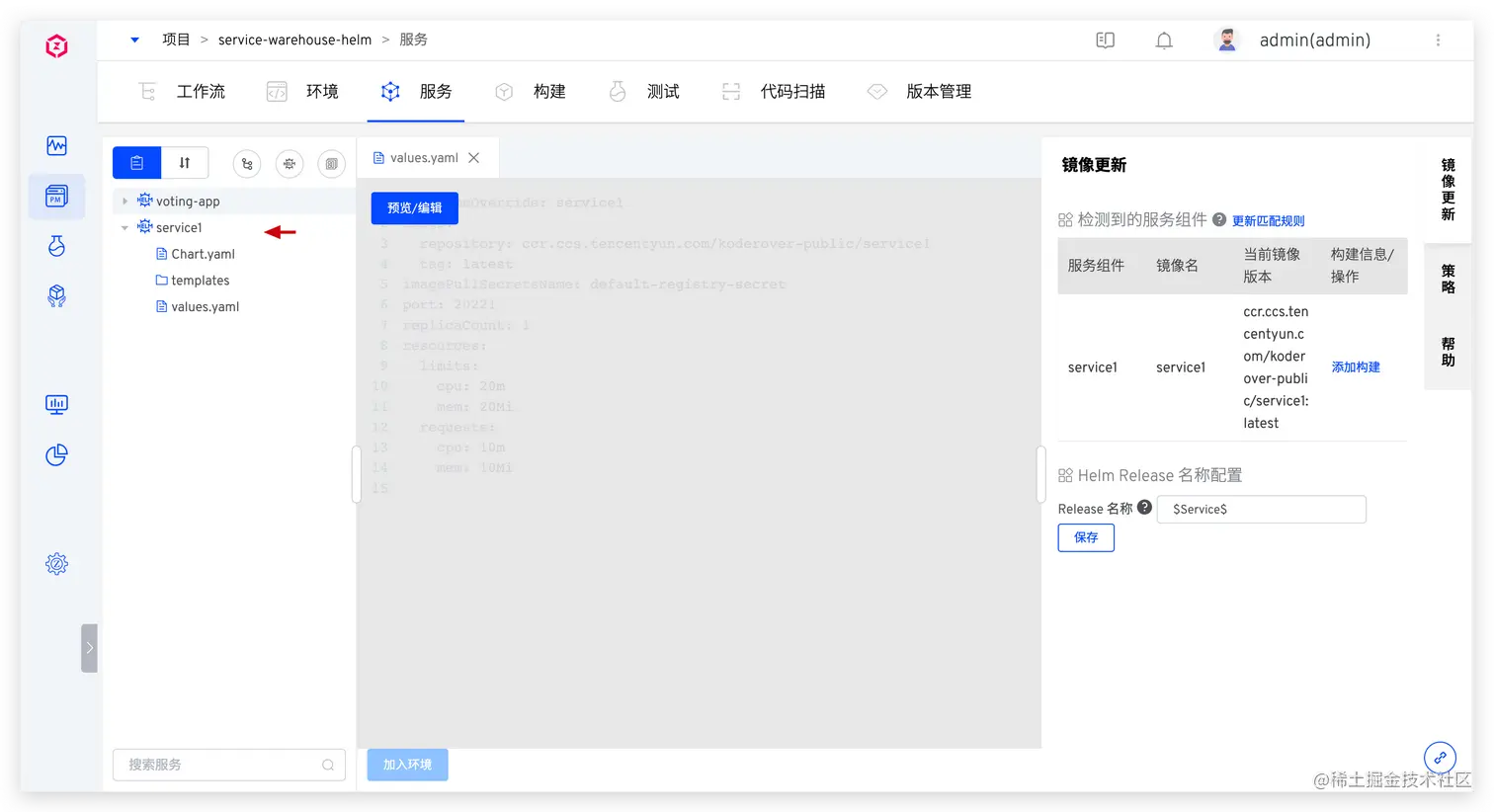 - 使用 Helm Chart 模板创建服务:抽象 Helm Chart 配置模板,在 values 文件中支持变量,指定少许变量即可快速创建服务,且一套模板可复用到多套环境中。