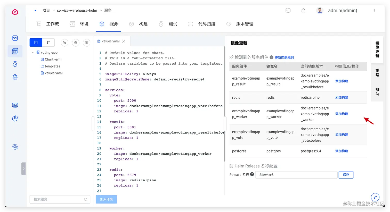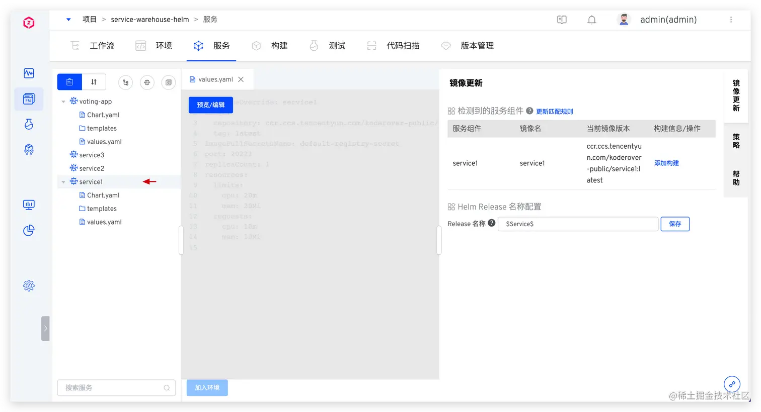 同步后,系统会自动分析 values.yaml,解析出多个服务组件。