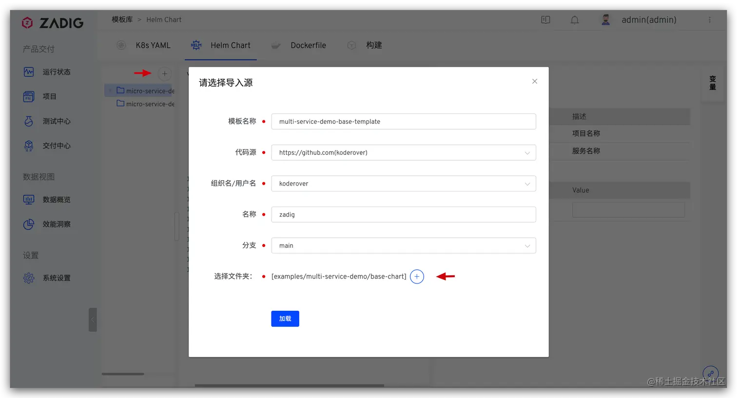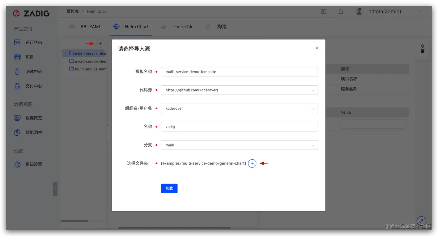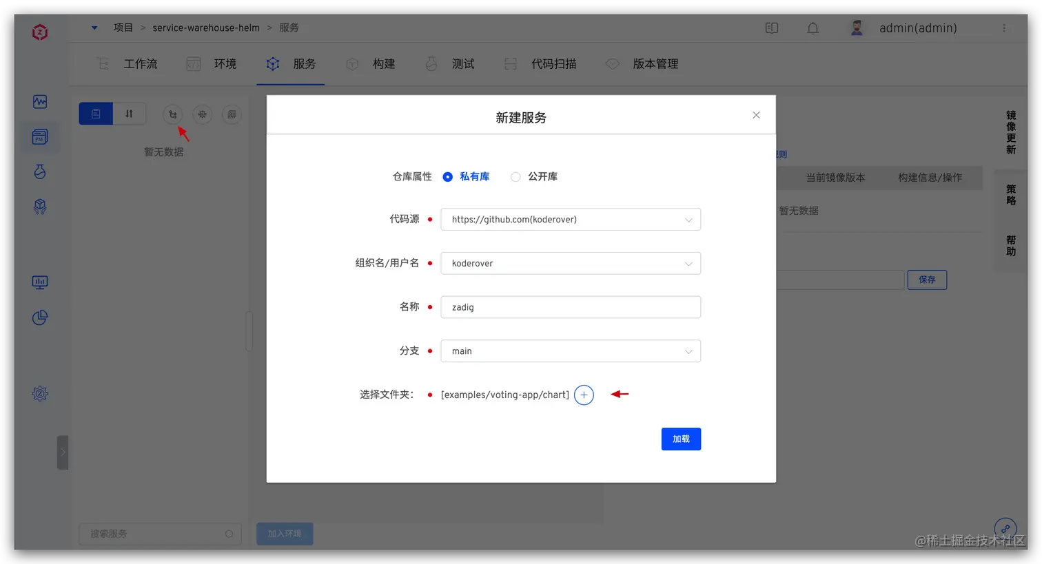 进入项目的服务模块 -> 点击从代码库同步 -> 选择代码库以及 Helm Chart 所在文件目录,点击加载(本例中即为 Zadig 库的 examples/voting-app/chart 目录)。