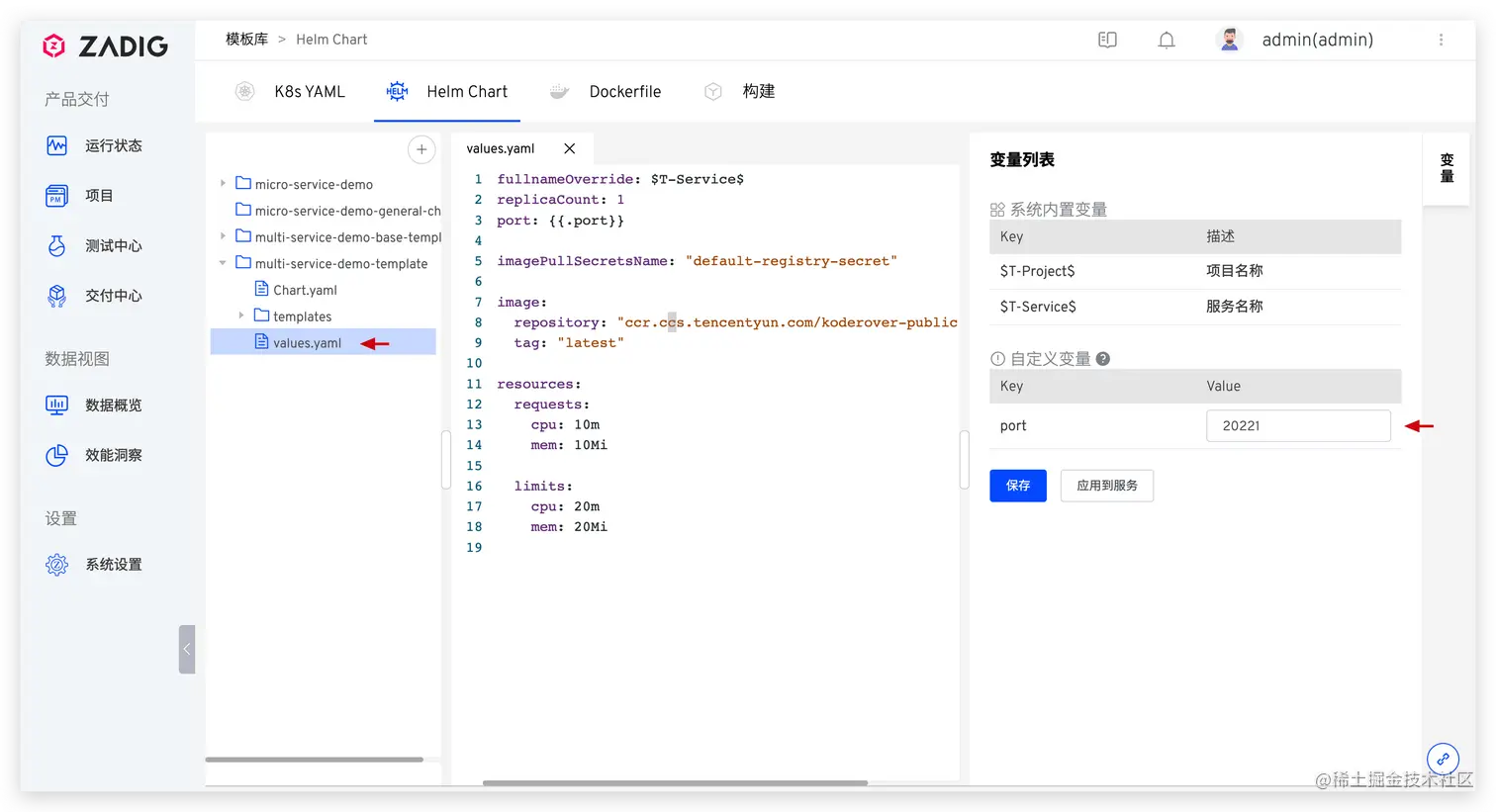 可以看到模板的 values.yaml 文件中使用了自定义变量 port 和系统内置变量 T-Service,在使用模板创建服务后,此处的变量会被渲染替换。