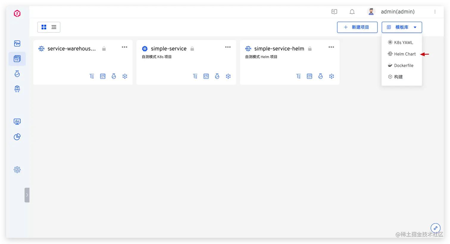 在项目预览页点击右上角的 模板库 -> Helm Chart 进入 Helm Chart 模板管理页面。