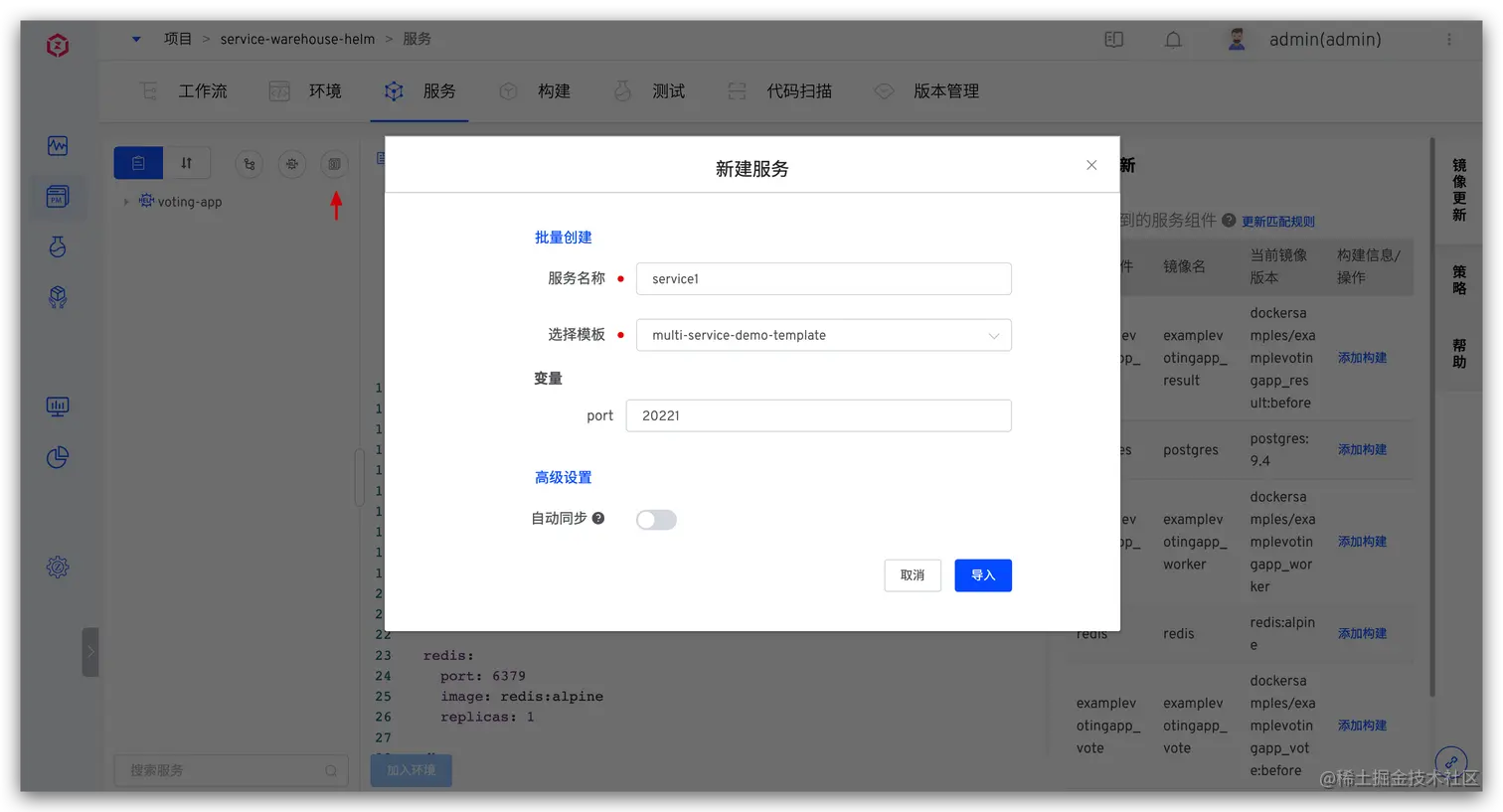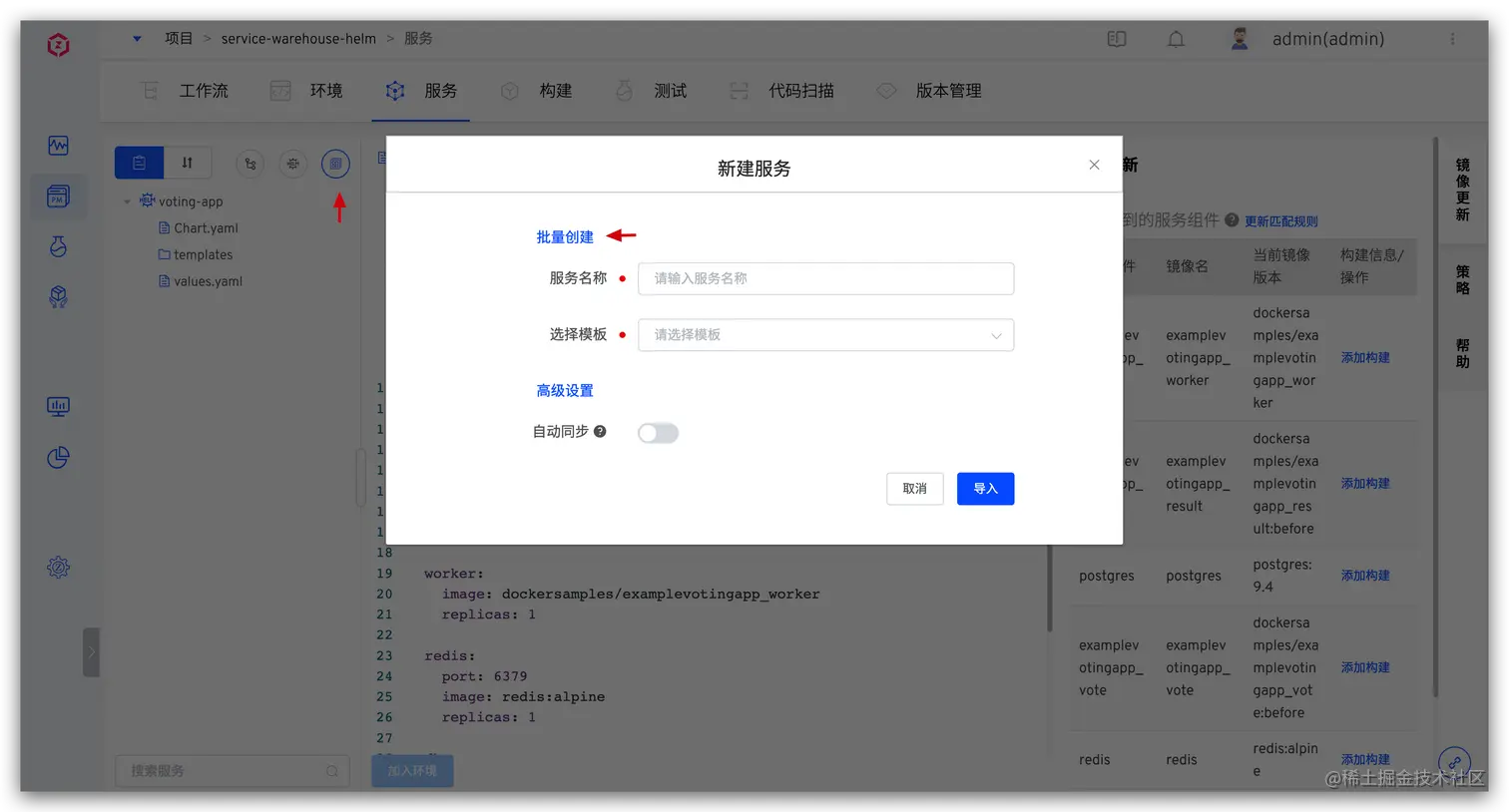 将多个服务的 YAML 配置组织在一个 Helm Chart 中,使用 Zadig 批量导入,下面以 voting-demo 项目为例演示说明: