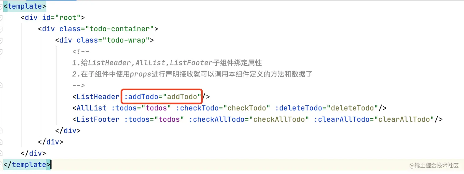 App.vue 组件里的这段代码, 使用 :addTodo 的方式给子组件 ListHeader.vue 绑定: 添加todo的事件