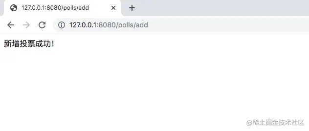 保存后,通过 python manage.py runserver 127.0.0.1:8080 命令启动本地开发服务器,启动后在浏览器中输入URL地址 http://127.0.0.1:8080/polls/add ,会返回如下页面表示新增数据成功。