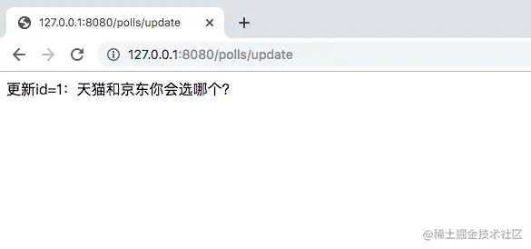 完成以上代码配置,我们就可以通过访问 URL http://127.0.0.1:8080/polls/update 实现第一条数据的更新操作,请求后返回页面如下: