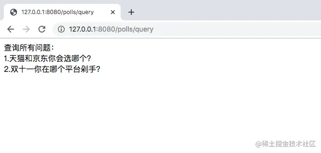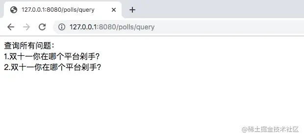 然后再浏览器中输入 URL http://127.0.0.1:8080/polls/query ,看到如下图所求请求结果: