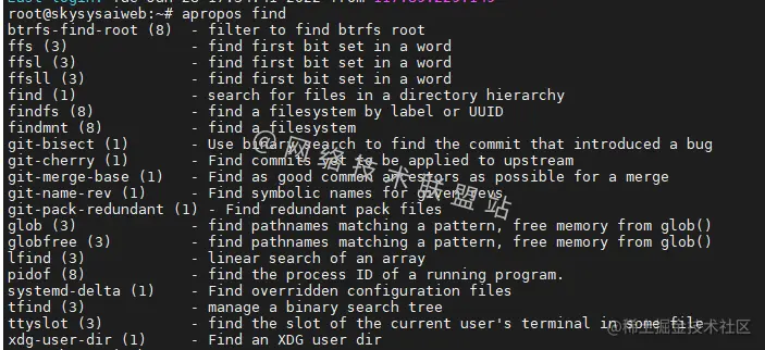 我们可以很清晰的看到跟find相关的命令有这么多,并且命令后面还有一些简单的解释。