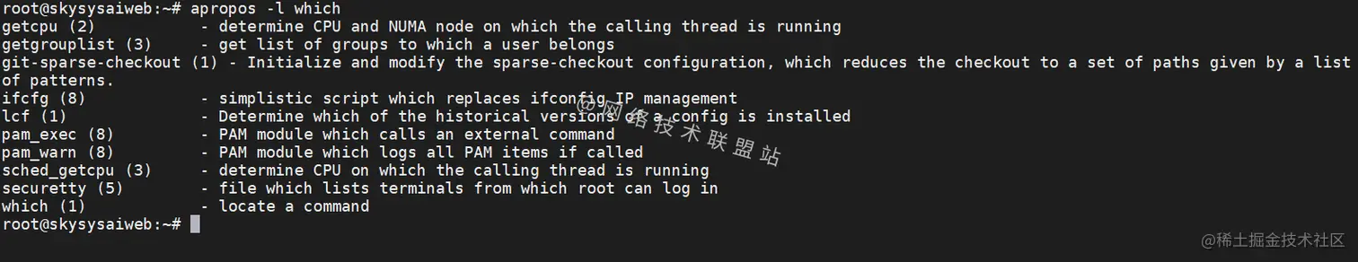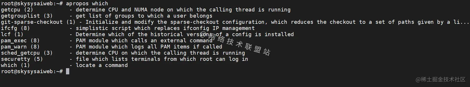 apropos在所有手册页中搜索带有在命令行中传递给它的关键字的命令,这些关键字可以是命令名称的一部分或与其功能描述相关,当不带参数使用时,apropos命令的功能与man -k命令完全相同。