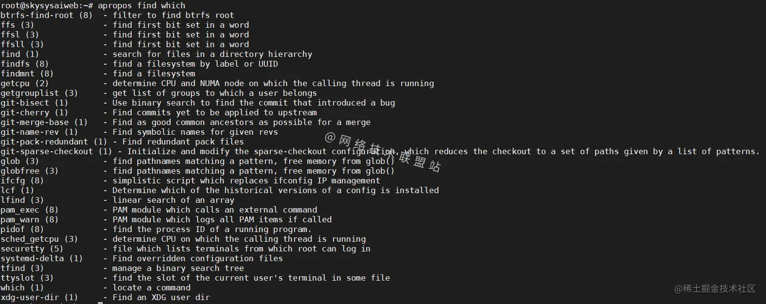 刚刚说了apropos find which命令会将包含find或者which所有的命令都会列举出来,假如我们只想列举与它们都相关的命令,应该怎么输入呢?