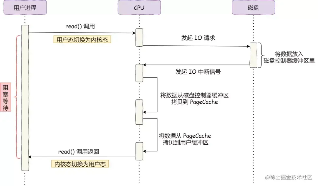 1. CPU收到中断信号,将磁盘控制器的缓冲区按字节依次读取到CPU寄存器中,然后将寄存器数据写入内存,此期间CPU不会调度进程做额外的计算工作。