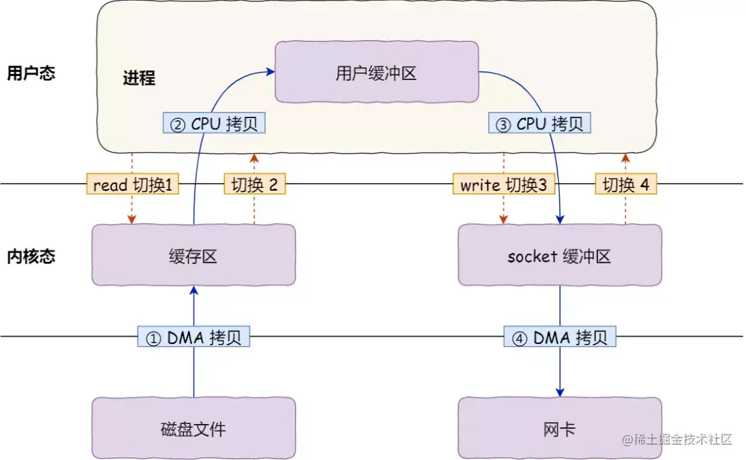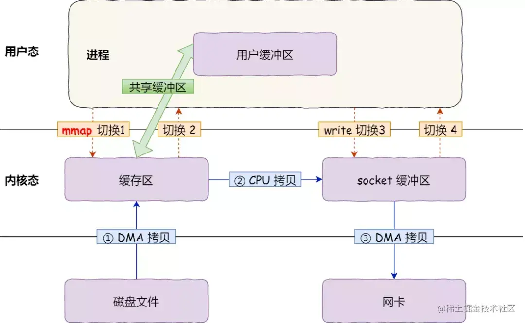 在Linux2.1版本中,系统提供了一个函数sendfile(),ssize_t sendfile(int out_fd, int in_fd, off_t *offset, size_t count);,它可以代替read和write两个系统调用,这样相比于mmap就会又减少一次系统调用,也减少了2此进程的上下文切换,全流程只需要2次上下文切换和3此数据拷贝。