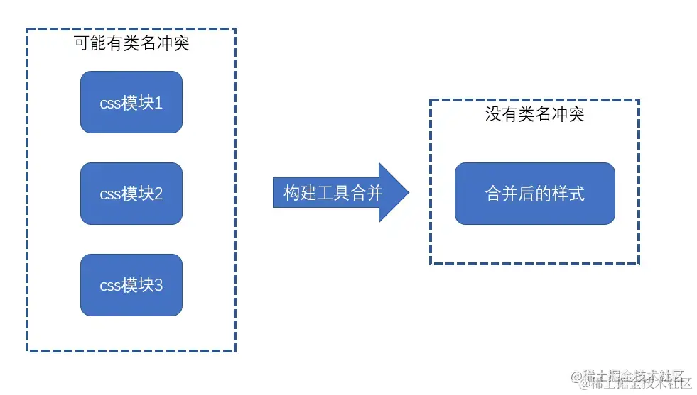 - 同JS的变量一样,每个css模块文件中难以出现冲突的类名,冲突的类名往往发生在不同的css模块文件中
