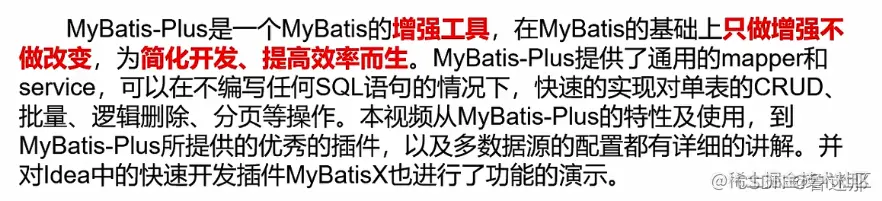 那从MyBatisPlus的特性及使用,到MyBatisPlus所提供的优秀的插件以及多数据源的配置都有详细的讲解,