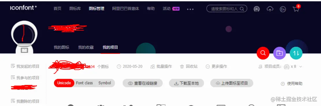 如图,首先如果是在正规的公司流程开发中,前端选好图标之后会有ui人员进行图标维护,然后上传至icon,网站,此时我们所要做的就是---加入项目,然后点击下载至本地--解压--替换本地font文件--引用font class进行项目开发,注意,这时候我们下载的文件是本项目截止目前最新、最全的icon图标,所以不必担心覆盖其他人文件的问题,可以愉快地进行团队开发,嘿嘿