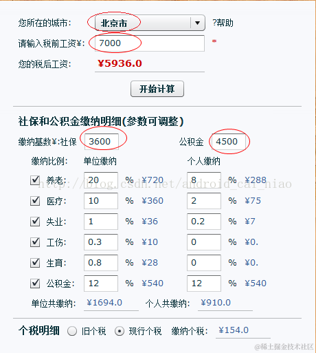 如上图的结果:工作地点为北京,税前工资是7000,社保的缴纳基数是3600,公积金的缴纳基数是4500,则单位要给我们缴纳1694元的费用,我们个人缴纳910元 + 个税154元,实际发到你卡上的工资金额为:7000 - 910 - 154 = 5936元,5936元是你真实到手的工资,感觉工资变少了,但是你个人缴纳的910元中,主要是缴纳养老保险和公积金的金额比较大,而养老保险n年后是有返回的,而公积金是可以取出来用的(具体怎么取,各个地方可能需要的条件不太一样),所以不要害怕个人缴纳的费用大而感觉自己发下来的的工资少了,实际上是没有少的,你要这样想:你的个人缴纳费用越大你应该越开心,这说明你的缴纳基数大,缴纳基数大的话,公司给你缴纳的那些费用就会跟着变大,你是赚的呢!比如你发现你的个人缴费的公积金是3000元,工资发下来就少了3000,你不应该难过,而应该高兴,因为公司也会为你缴纳3000元,这样你的公积金总共有6000元,这样工资不但没有少3000元,反而多了3000元^_^