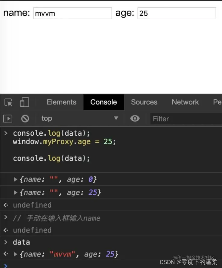 先打印了data,然后模拟有异步数据过来,手动修改data里的数据window.myProxy.age=25,这时候页面上的age联动变化为25,再次打印了查看data。接下来在页面上手动输入name,输入完成后触发输入框的onchange事件后,再次查看data,此时model里的数据已经变化为最新的与页面保持一致的值。