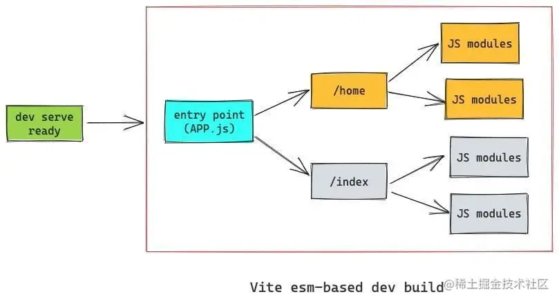 Webpack 这样的基于打包器的工作流必须在单个浏览器请求之前处理整个 JavaScript 模块,但 Vite 只在单个浏览器请求之前处理依赖模块。这就是为什么 Vite 能够比 Webpack 更快地处理开发构建。