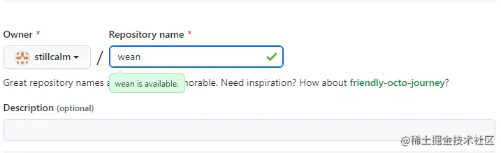 这里是创建仓库信息,只有名字是必填的选项,现在我新建了一个名为 wean 的仓库。